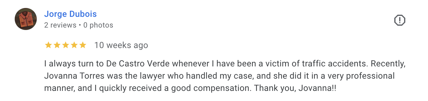 The attorneys at De Castroverde Law Group have over a century of combined experience representing injury victims. Our lawyers are seasoned litigators and negotiators who fight for a fair outcome in your case. Contact us to put our team to work resolving your injury claim.